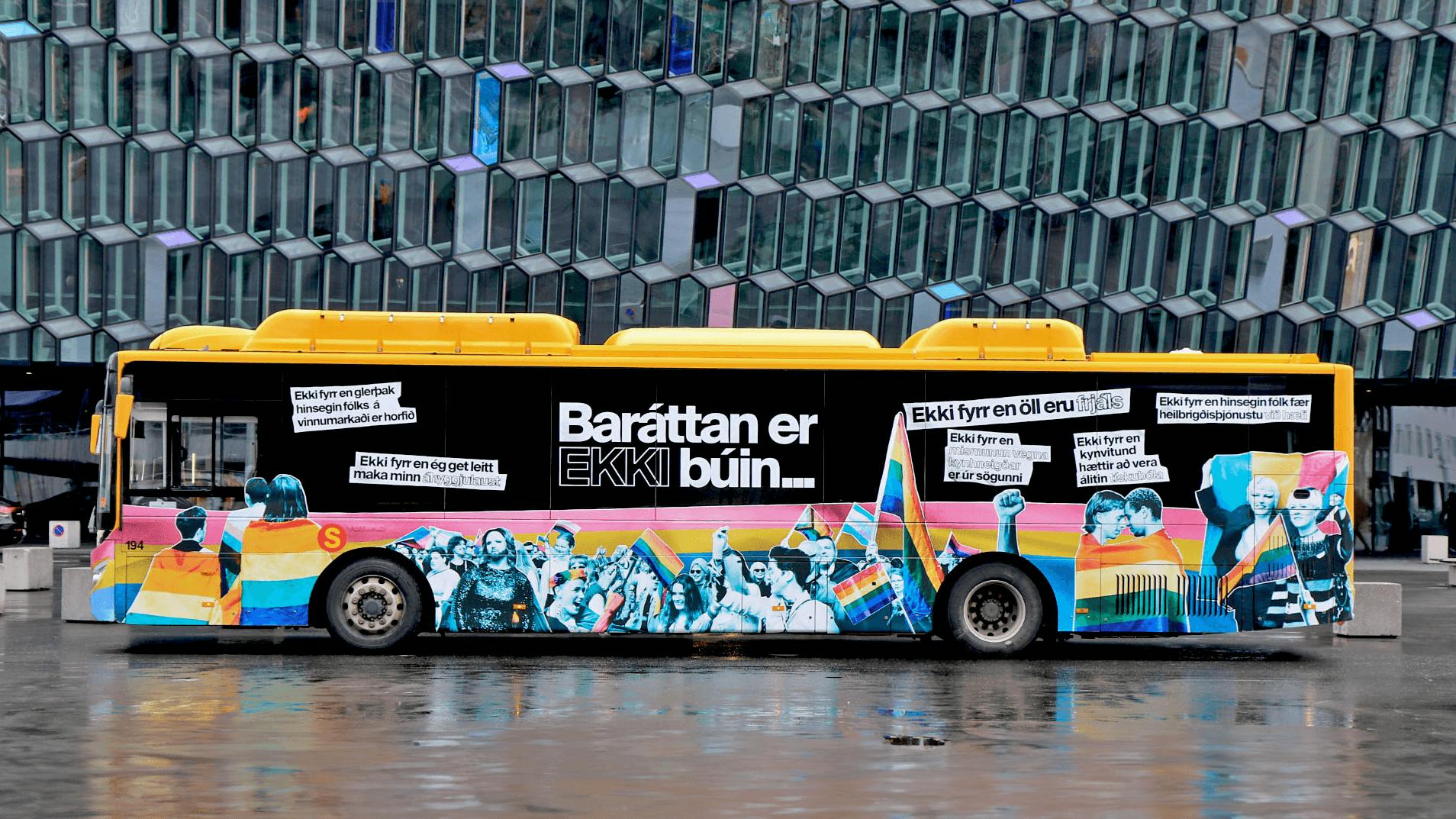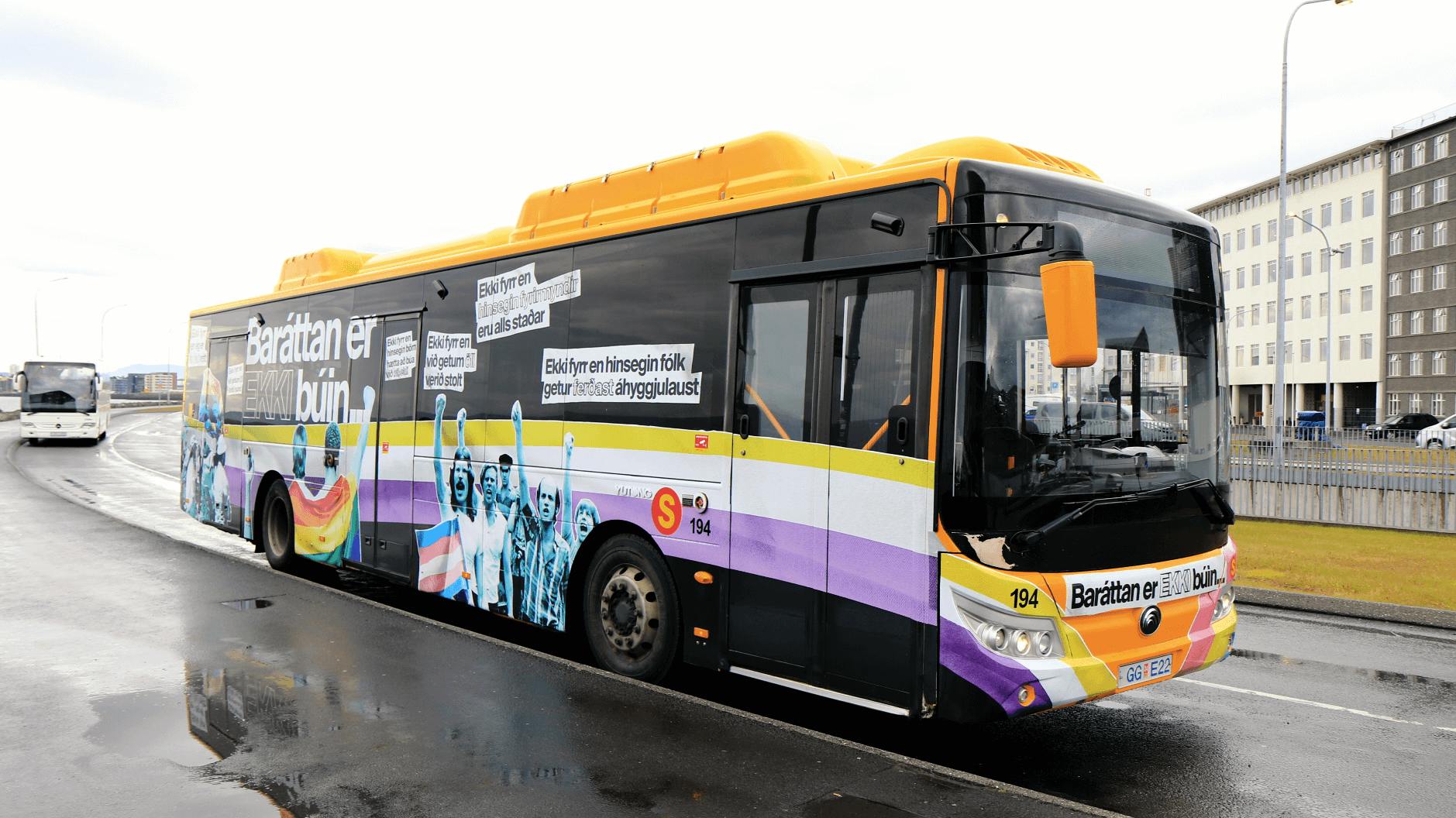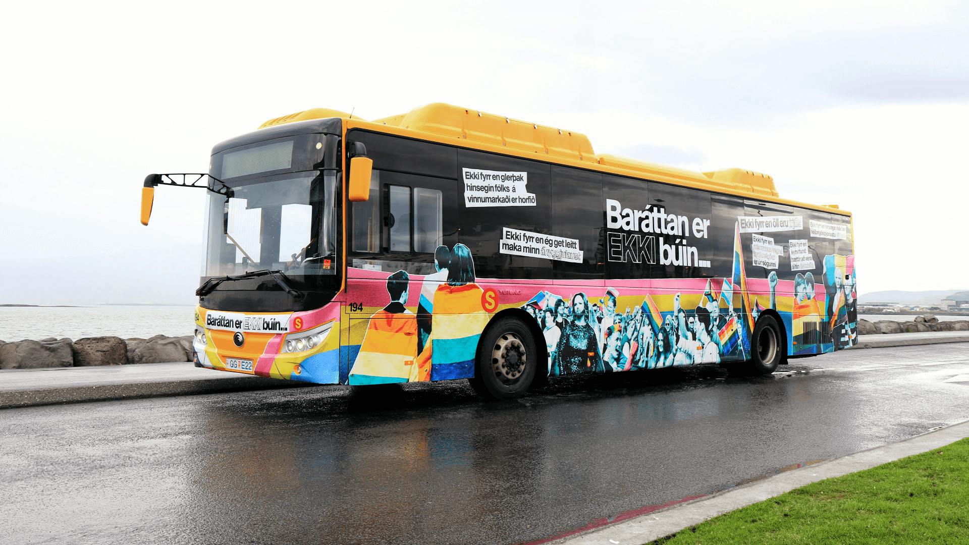 Í stað þess að heilmerkja strætó, eins og hefð hefur verið fyrir undanfarin ár, var vagninn skreyttur á hátt sem minnir á veggspjöld sem hengd eru upp á húsveggjum.