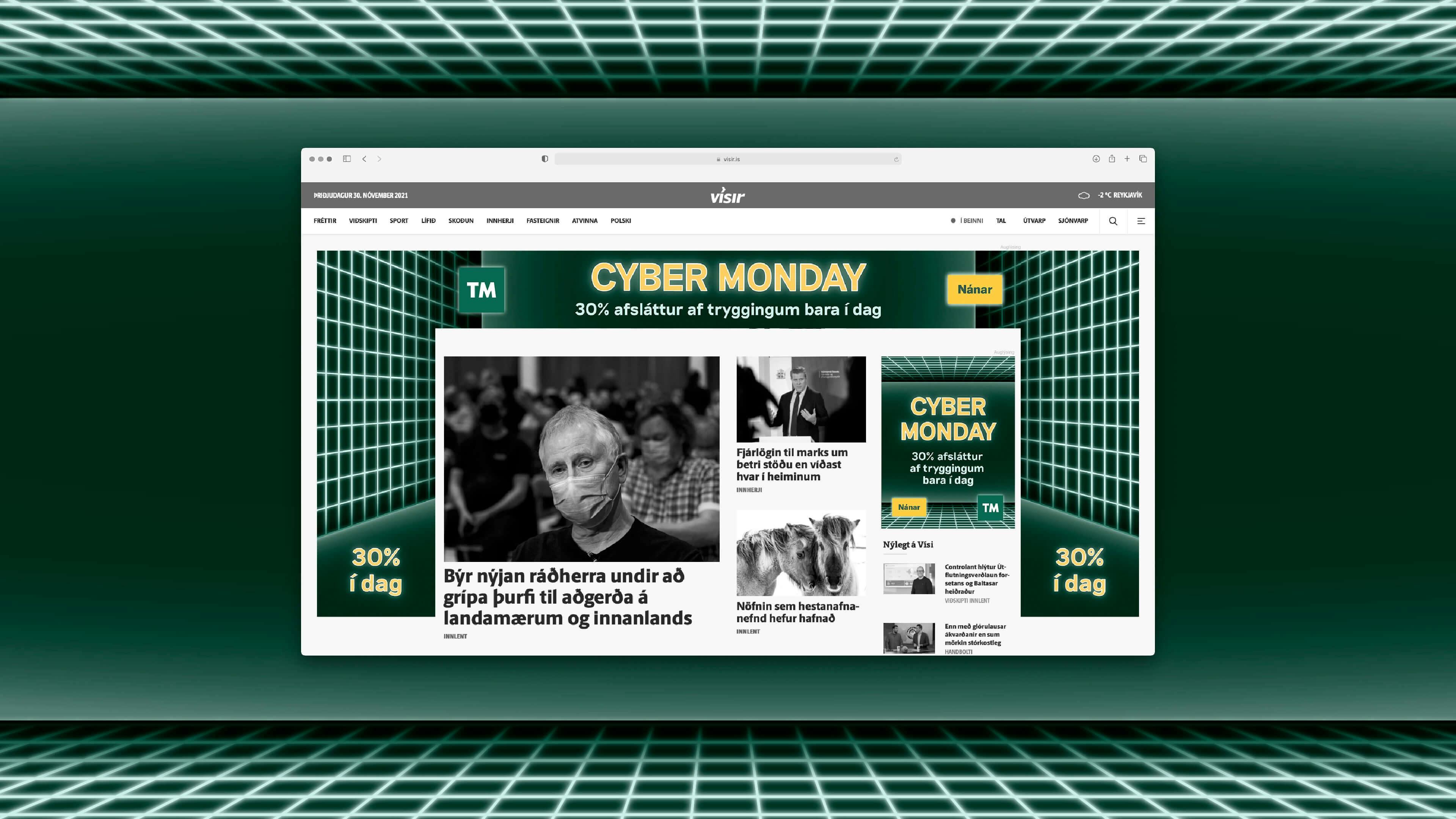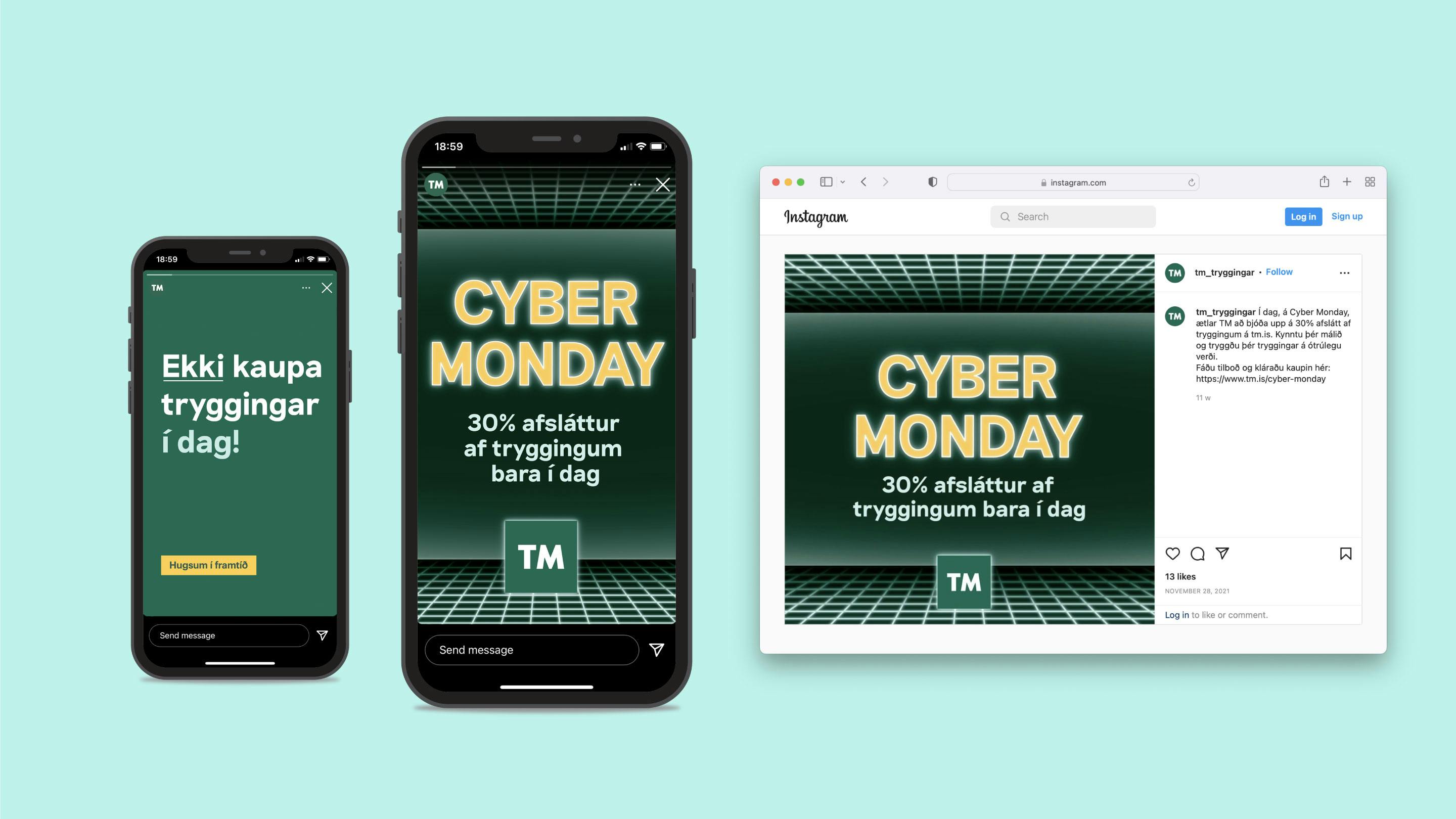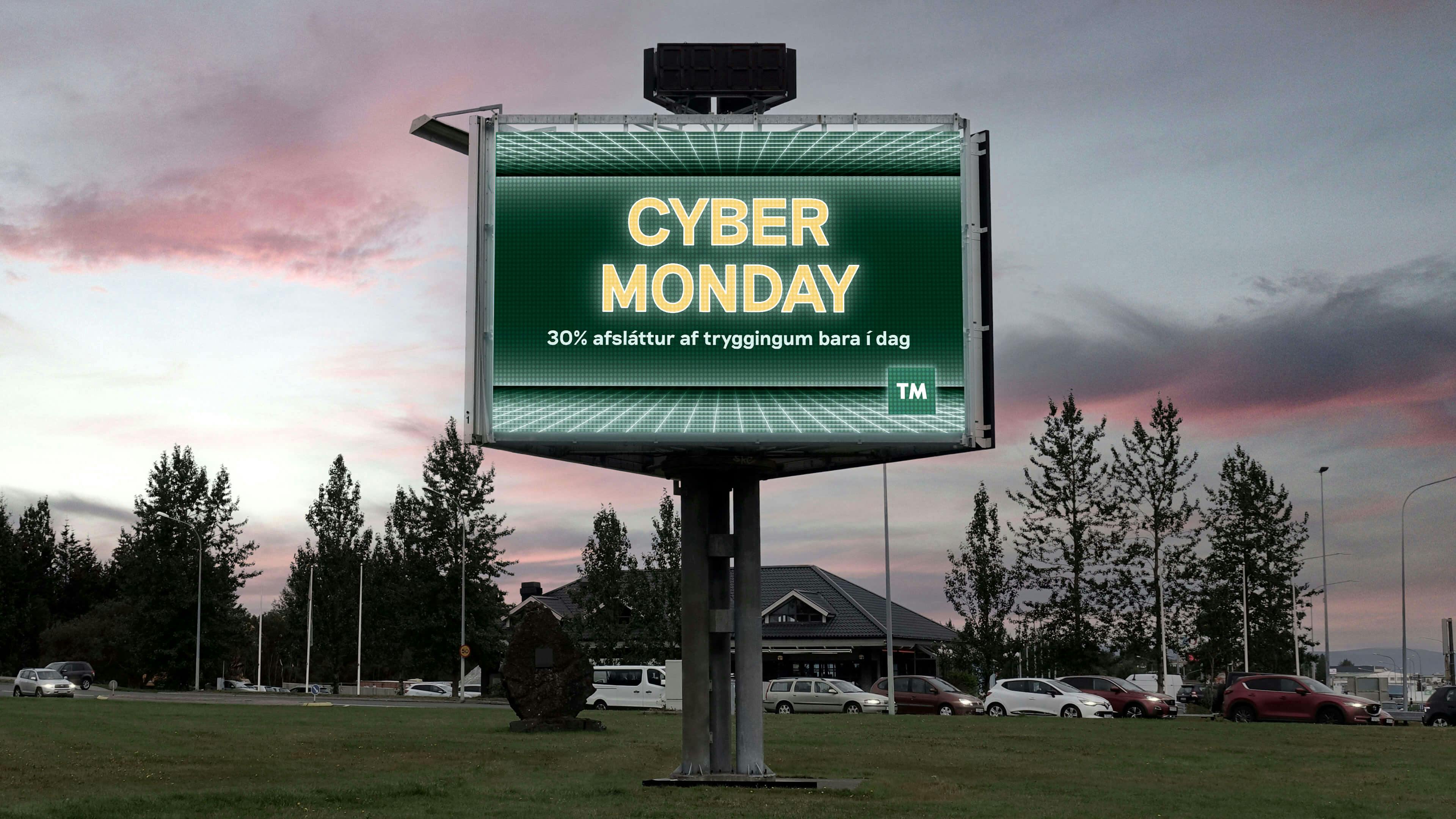 Við hjálpuðum TM að hrista upp í tryggingamarkaðnum. Fyrst með forherferð sem hafði það að markmiði að vekja forvitni. Í kjölfarið fylgdi svo hávær og afsláttardrifin Cyber Moday herferð sem sótti innblástur í tölvugrafík níunda áratugarins og var hóflega langt frá settlegu og vinalegu útliti TM. Talsverður fjöldi fólks lét vaða og sjálfsagreiddi sig um tryggingar á hagstæðum kjörum á Cyber Monday.