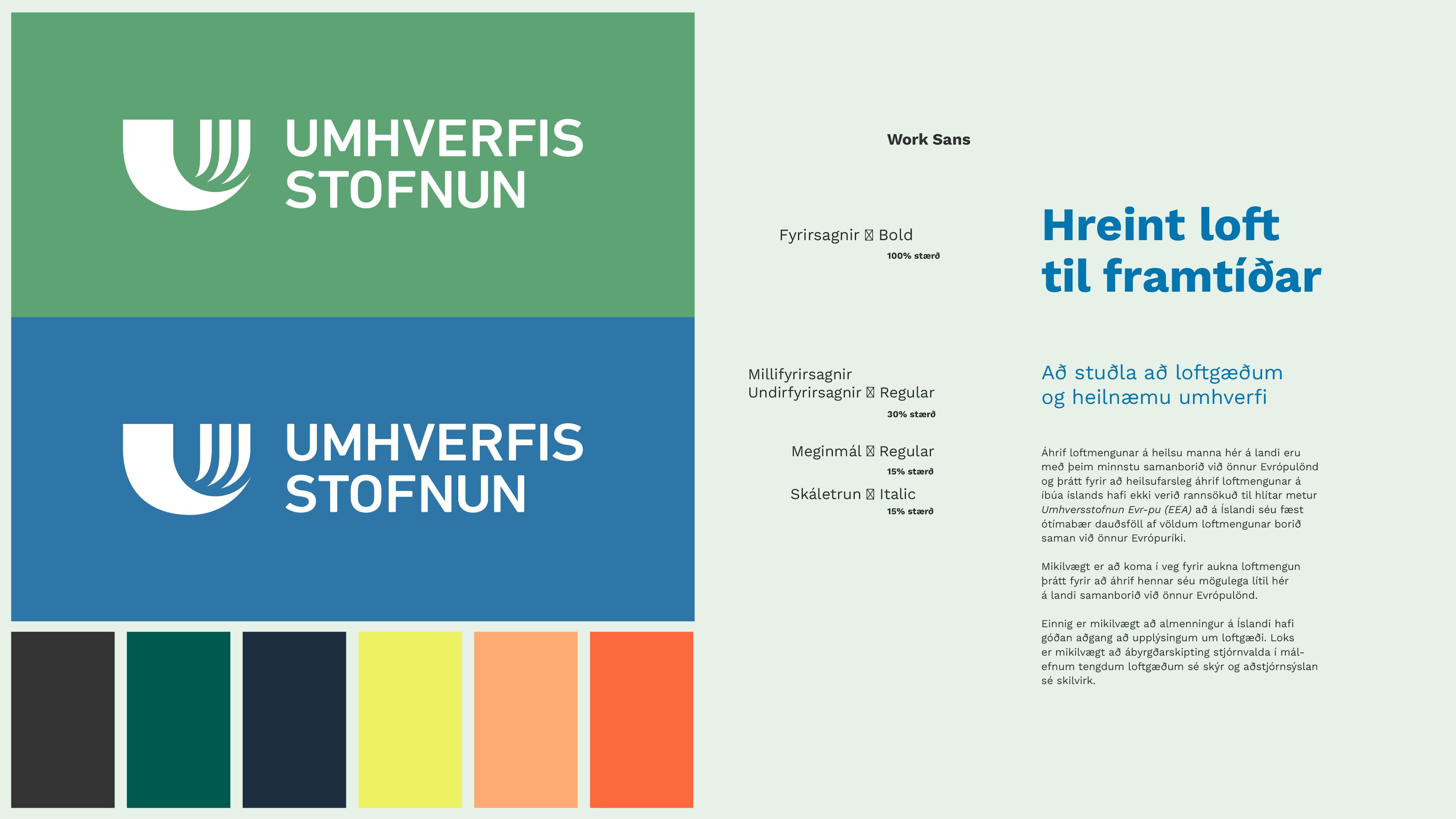 Firmamerki Umhverfisstofnunar er stílhreint, lýsandi og hefur lifað nógu lengi til að vera verðmæt táknmynd. Ekki var þörf á að fara í breytingar á því. Frískað var upp á liti og leturgerðir til þess að gera vörumerkið nútímalegra. Grunnlitir voru aðlagaðir fyrir stafrænt umhverfi og litapalletan var einfölduð.