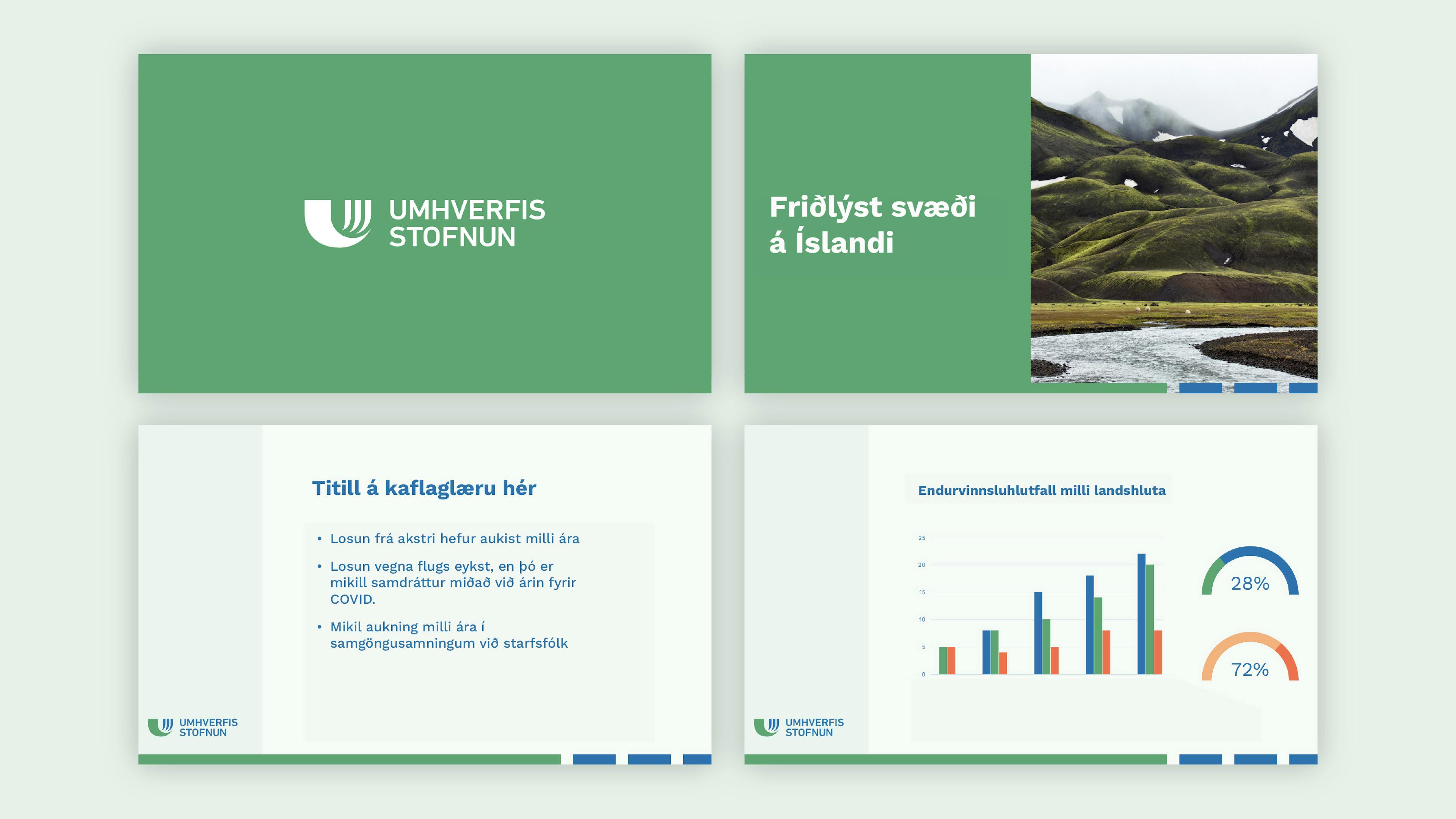 Stuðningslitir sem nýtast í skýrslur, gröf og annað útgefið efni var einnig innleitt. Öll þessi grafísku tól styðja Umhverfisstofnun í hlutverki sínu; að þjónusta fólk og náttúru í þágu umhverfisverndar.