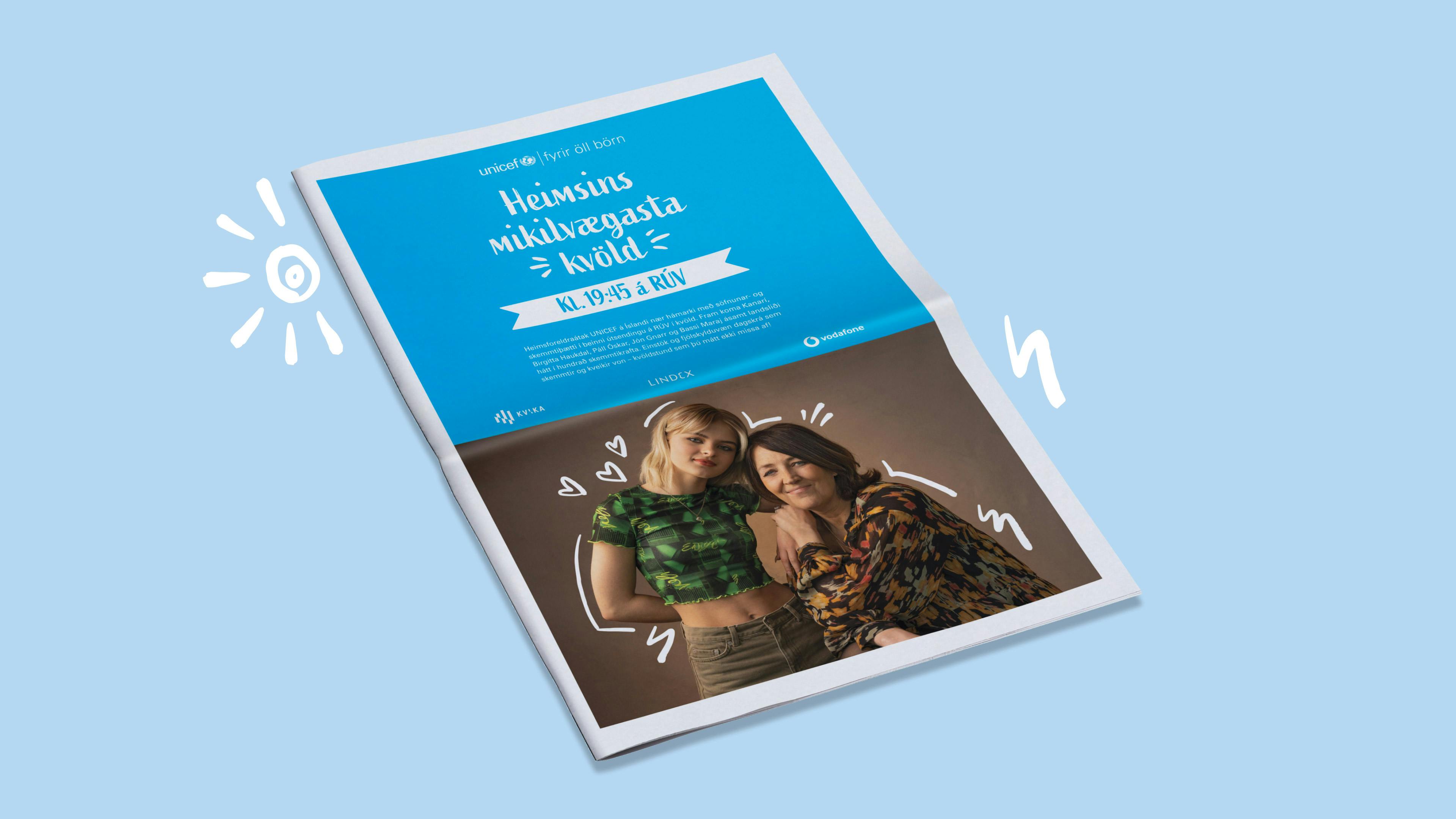 Auglýsingaherferð og söfnunarátak fyrir Heimsforeldra Unicef. Verkefni náði hápunkti í söfnunarþættinum Heimsins besta kvöld sem sýndur var í beinni útsendingu á Rúv.