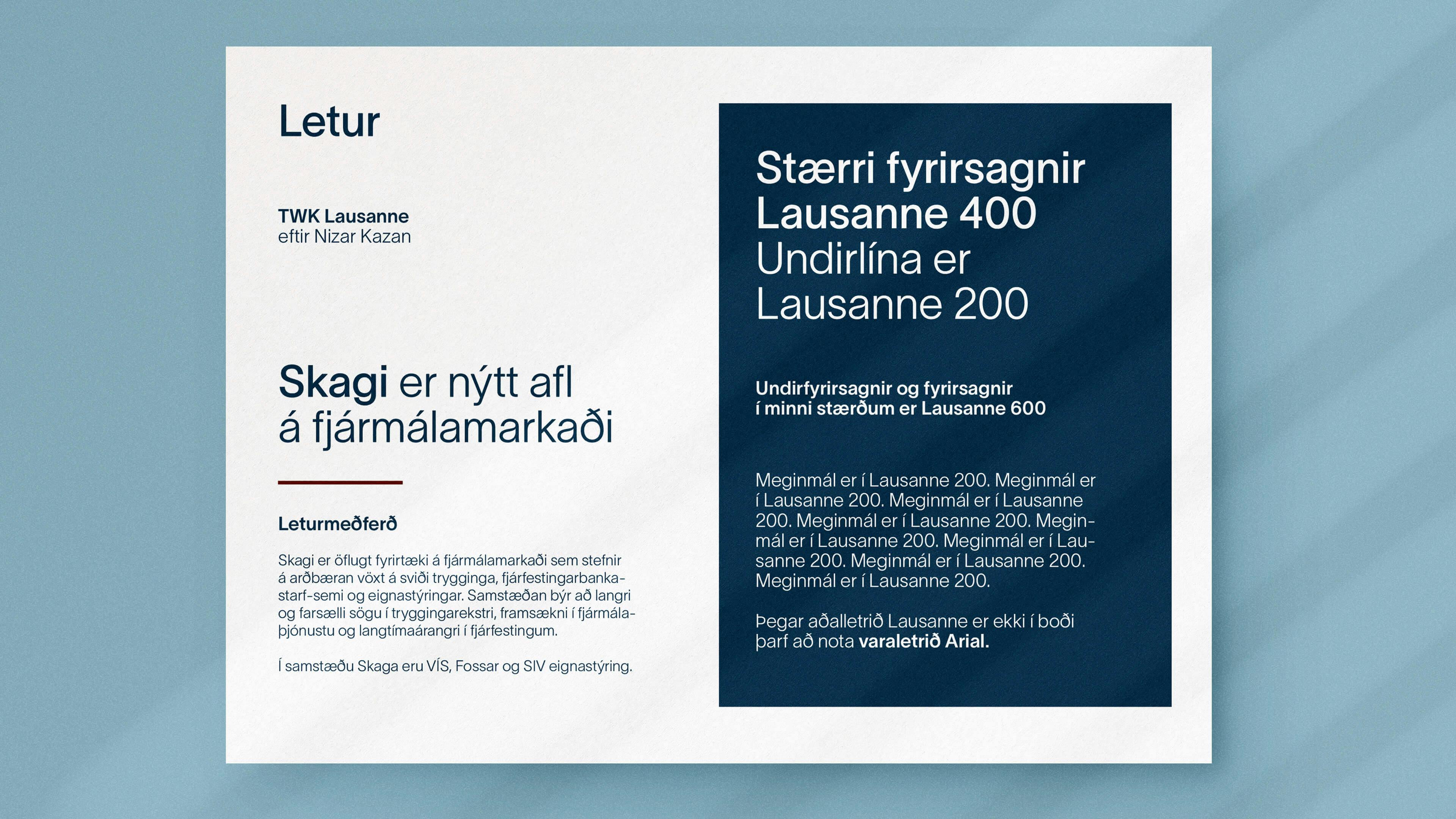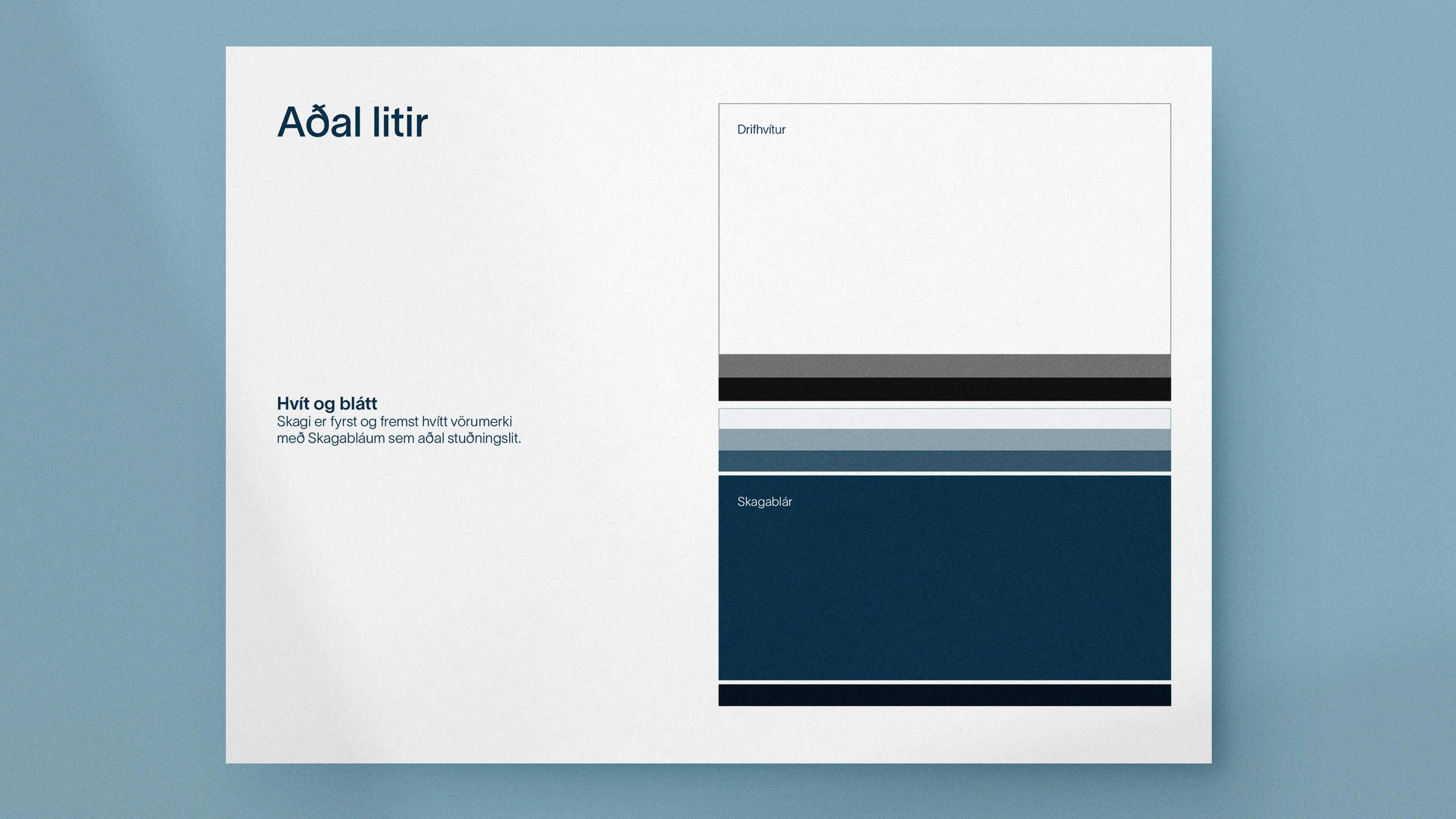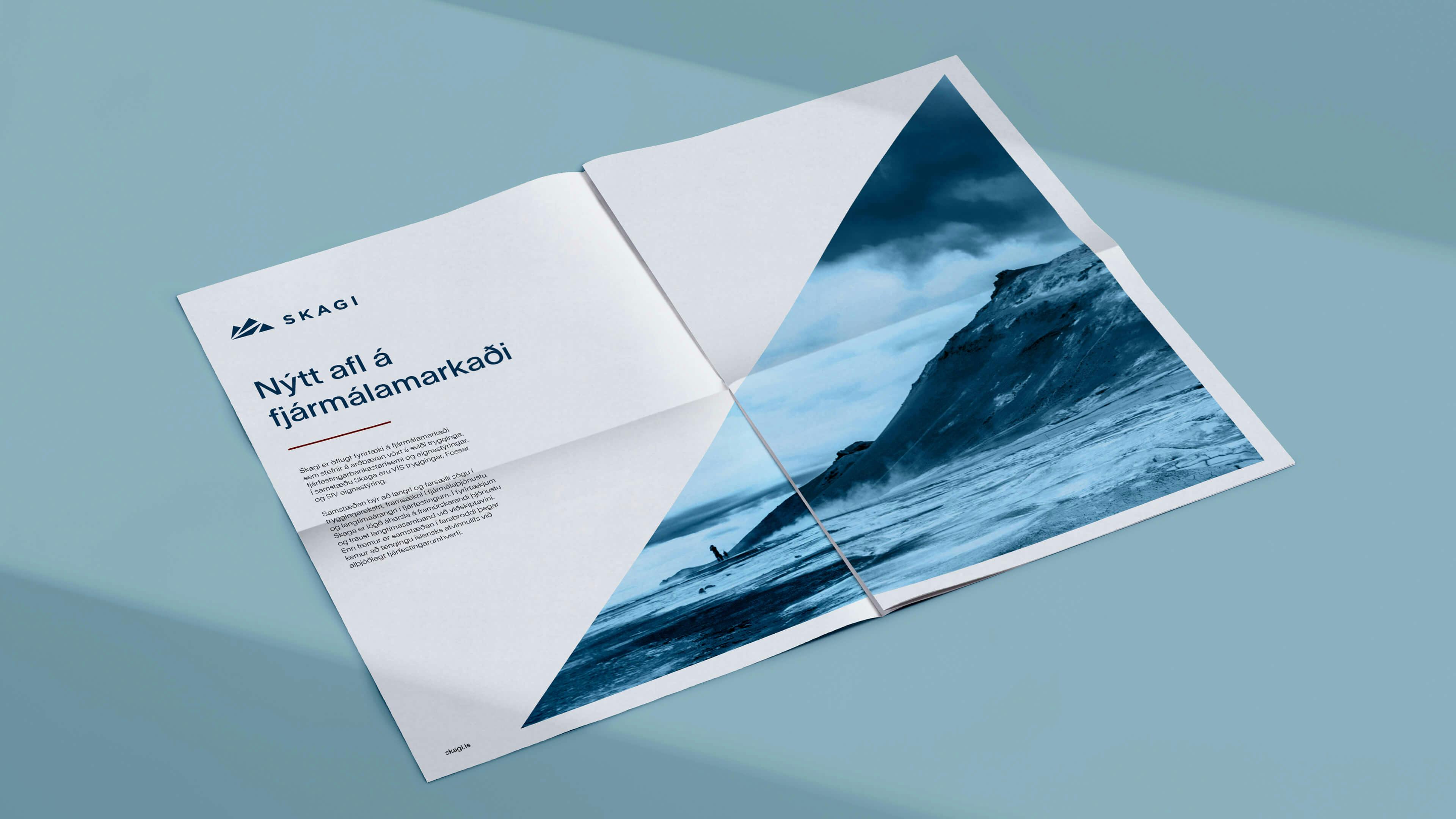 Tvist fékk það verðuga verkefni að móta vörumerkið frá grunni, allt frá nafngift til yfirbragðs. Myndmerki Skaga vísar í íslenska náttúru og sterka samvinnu. Grafíkheimurinn er fagurblár, og Skagablár þar fremstur í flokki. Myndheimurinn samanstendur af tignarlegum fjallstindum sem tákna skýra stefnu upp á við.