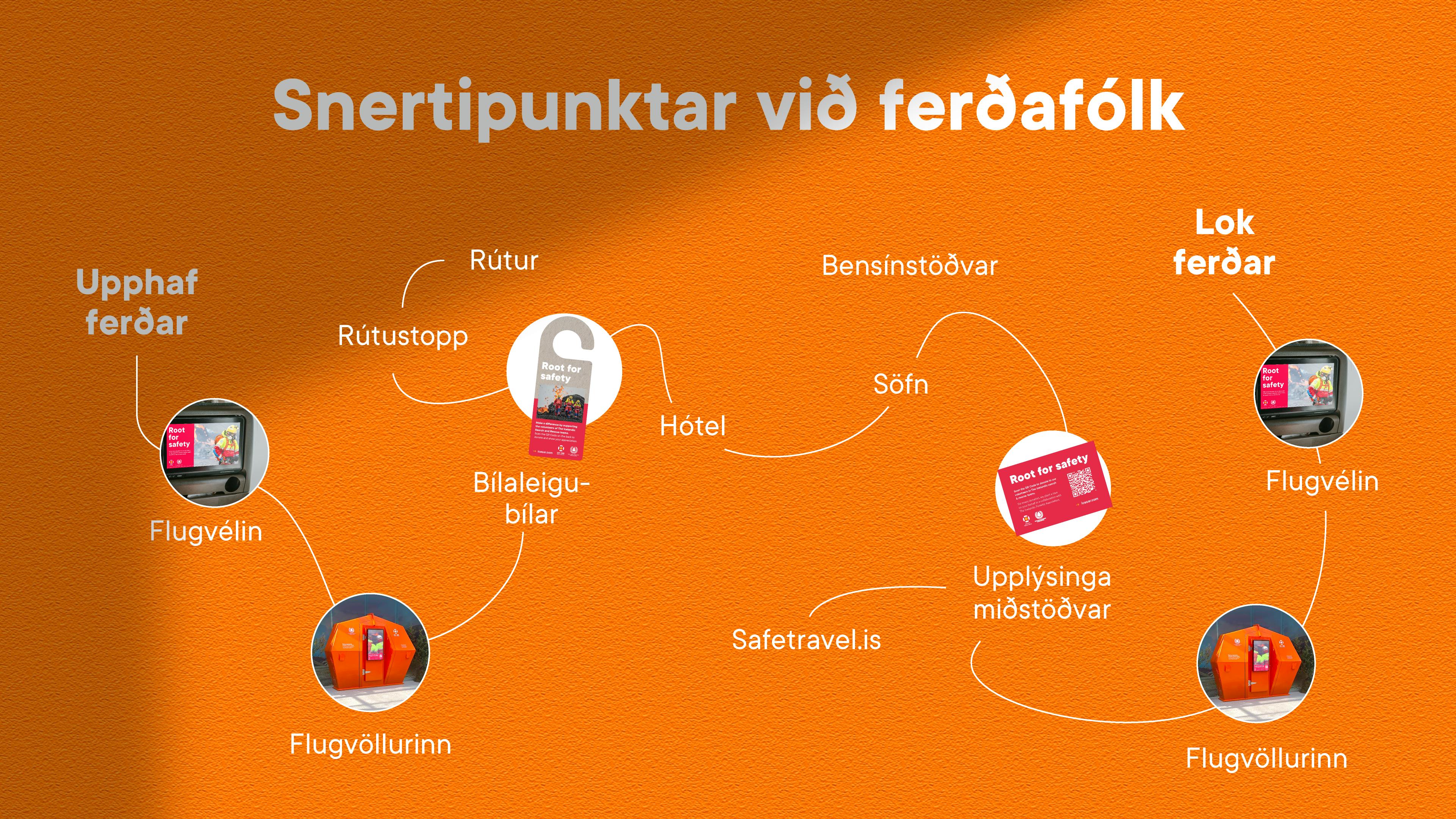 Í ljósi þess að ferðafólk sér ekki sömu miðla og heimafólk voru helstu snertipunktar við þau kortlagðir. Markaðssetning á Root for safety fór því fram á hótelum, í bílaleigubílum og á öðrum stöðum þar sem leið þeirra liggur um landið. Auglýsingar birtust í afþreygingarkerfi Icelandair og birtingar miðuðu að því að hitta ferðafólk í þeim miðlum sem þau lesa. Fjölmiðlaumfjöllun birtist í miðlum sem ferðafólk les.