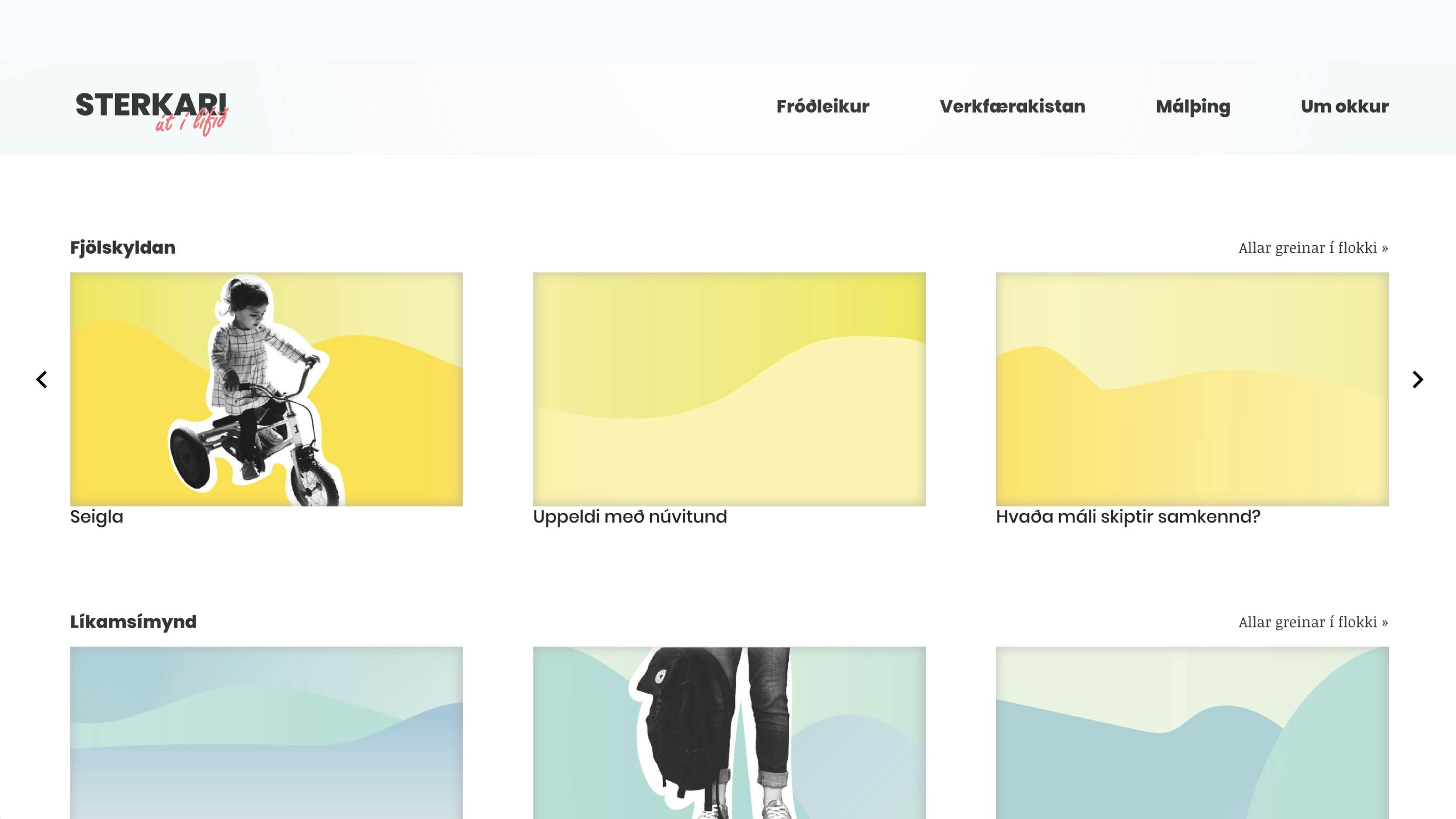 Að efla geðheilsu barna og unglinga er eitt mest aðkallandi verkefni samfélagsins. Það var því jafn gefandi og það var gaman að leggjast á árina með breiðum hópi fagaðila við gerð heimasíðunnar Sterkari út í lífið sem er ætlað að auðvelda samtöl um ýmislegt sem lýtur að styrkingu sjálfsmyndar. Okkar framlag fólst í stefnumótun verkefnisins auk þess sem við hönnuðum hina mannvænu og viðmótsblíðu heimasíðu. Og svo lærðum við heilmargt í leiðinni.