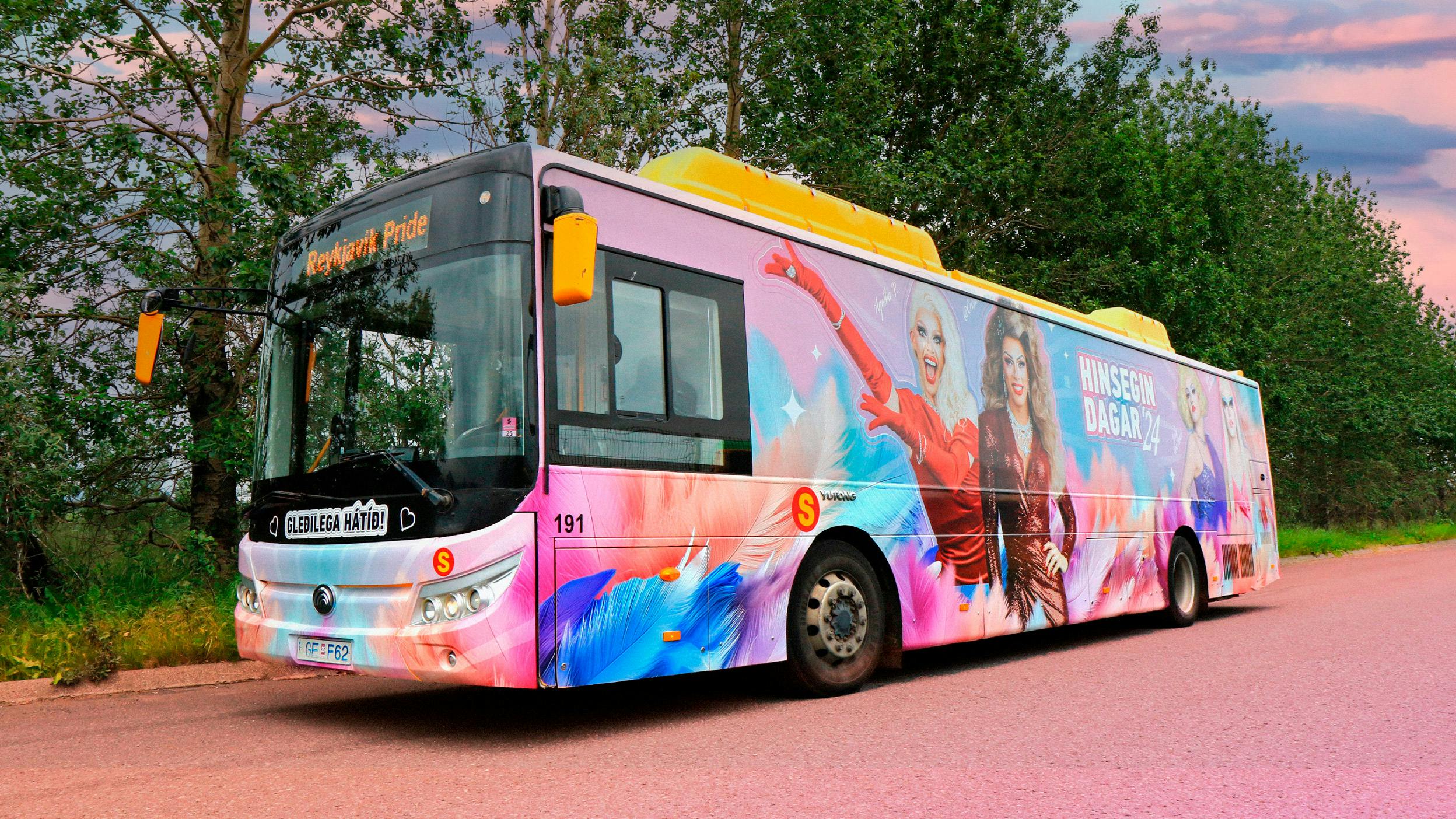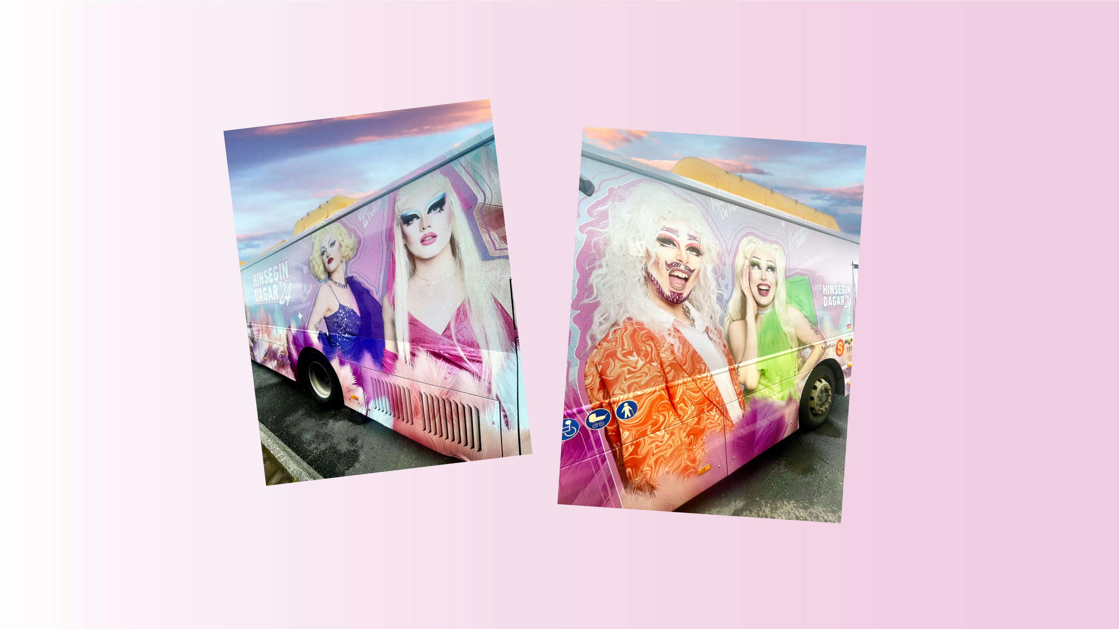 Reykjavík Pride vagninn fór í drag í tilefni Hinsegin daga 2024. Strætó fékk aðstoð frá rjóma íslensku dragsenunnar til að myndgera vagninn í ár með glamúr, fjöðrum og gordjöss klæðnaði.