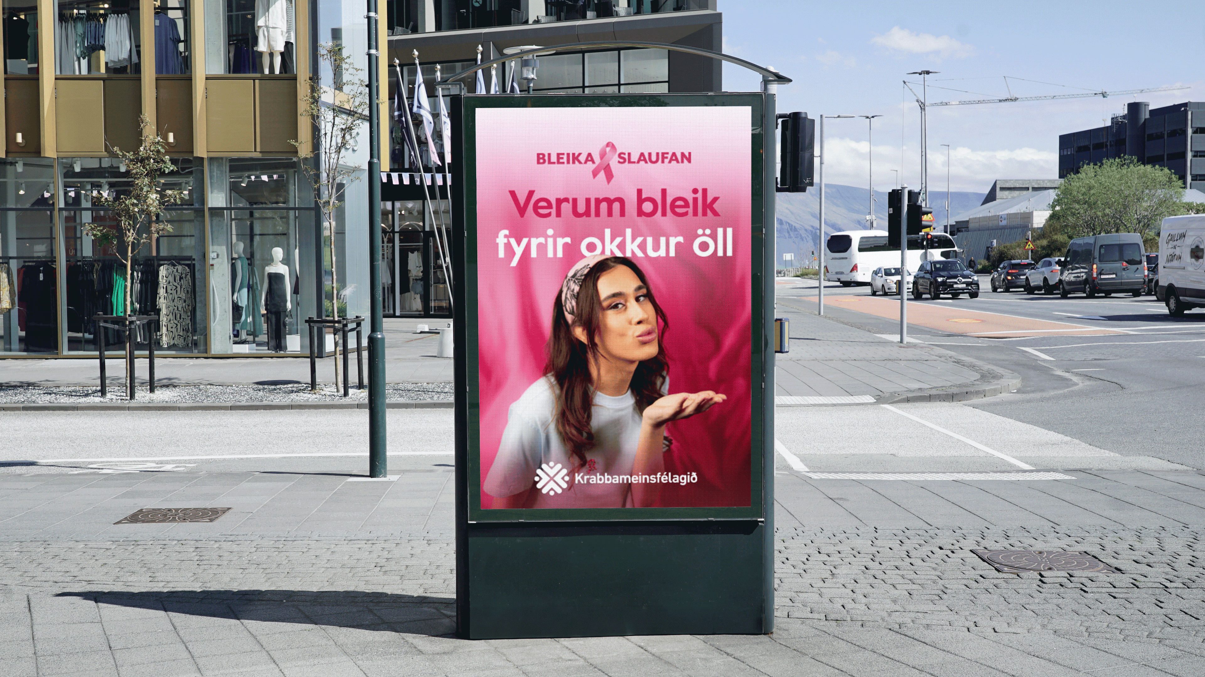 Sveppi er í fúlu skapi í rigningu. Svandís Dóra keyrir fram hjá og býður honum far. Saman ferðast þau inn í bleikan heim slaufunnar þar sem samstaða, gleði og falleg sólsetur ráða ríkjum. Skot úr auglýsingunni í bland við okkar þekktasta fólk hleyptu svo herferðinni af stað og máluðu bæinn fagurbleikan.